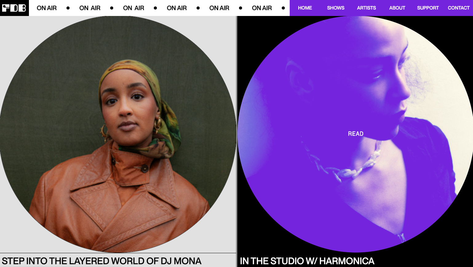 For Free Dimension Broadcasts, a music platform based in New Jersey, we developed a comprehensive visual identity, website, and social media templates that reflect their mission to connect, inspire, and uplift emerging artists. Inspired by the idea of a retro-futuristic broadcast channel that transcends time and space, we reimagined their logo in the style of vintage television networks like CBS and PBS, paired with a color palette drawn from the ambient glow of their studio. To complete the system, we introduced photo treatments referencing TV static—designed as repeatable effects the team can easily apply. With FDB still in its early stages, our focus was on creating a flexible brand foundation that can grow alongside their vision for the future.
